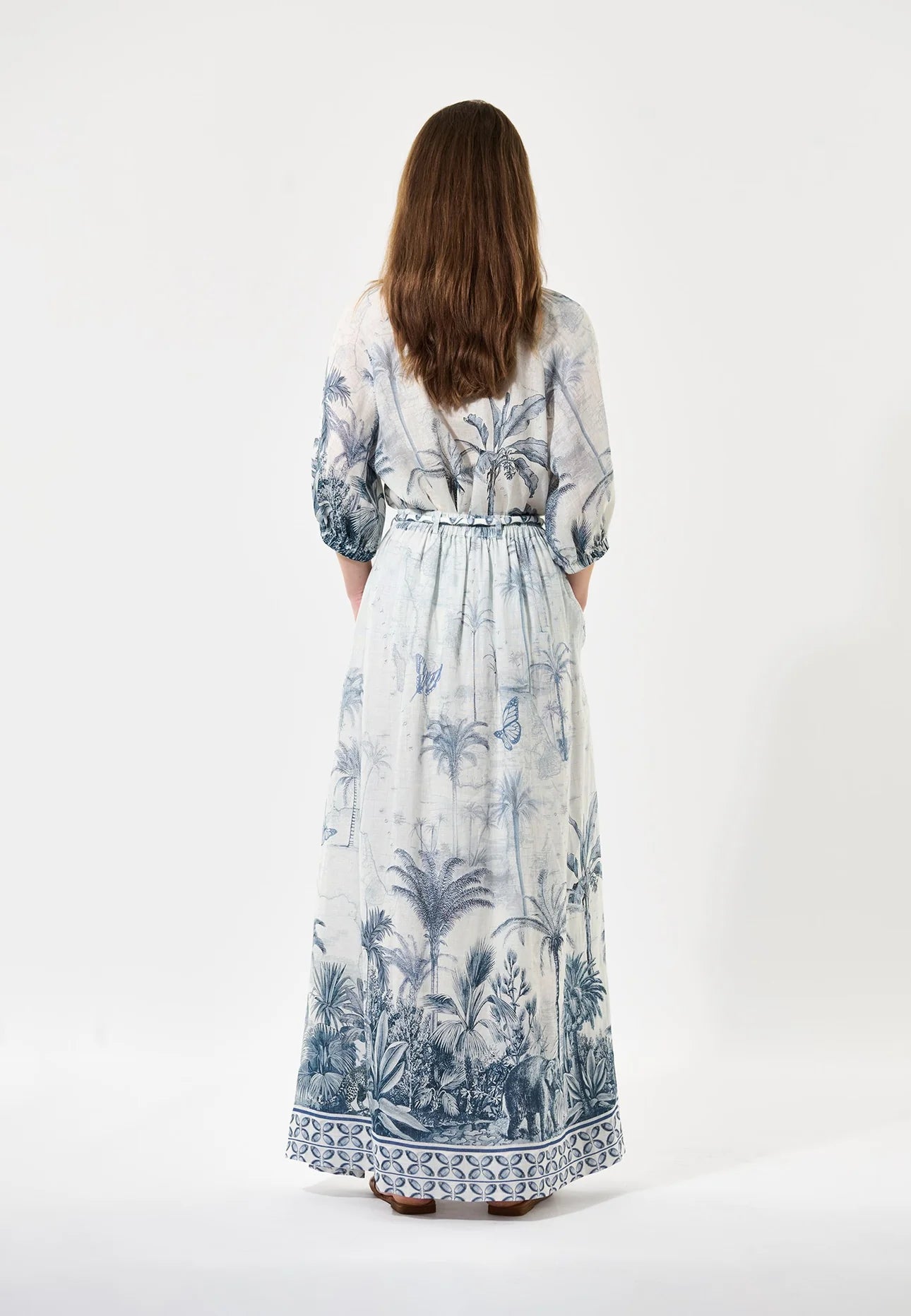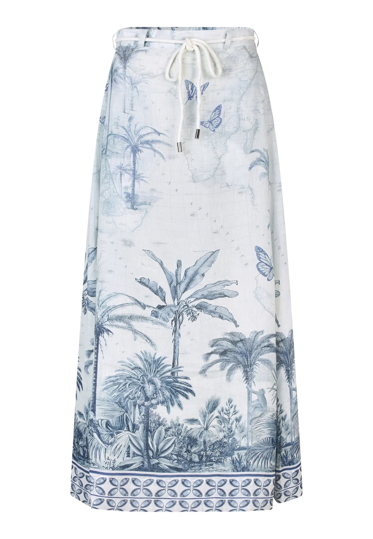 Med sit detaljerede print af antikke landskabstegninger er denne udsvingede nederdel i hør perfekt til sommeren. Den er hellang og har et bindebælte i samme stof med blå kaffebønner som en elegant afslutning. Nederdelen kan let lægges op efter smag.
