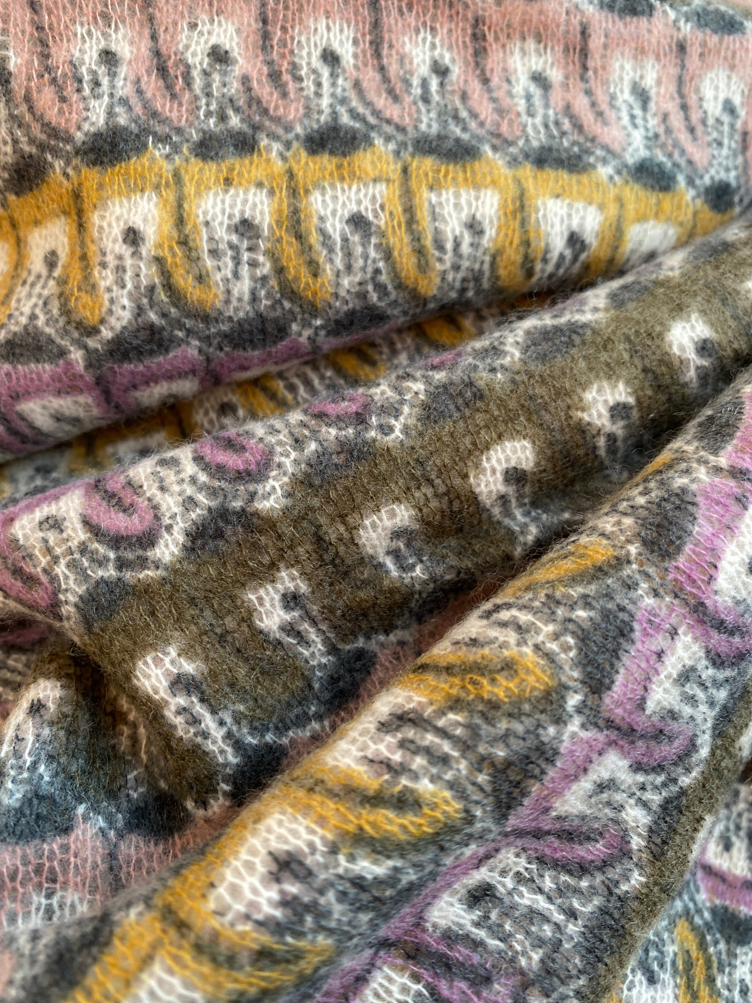 De delikate farver i støvede nuancer af rosa, oliven, gul og grålilla giver et elegant, moderne udtryk, der løfter ethvert outfit.