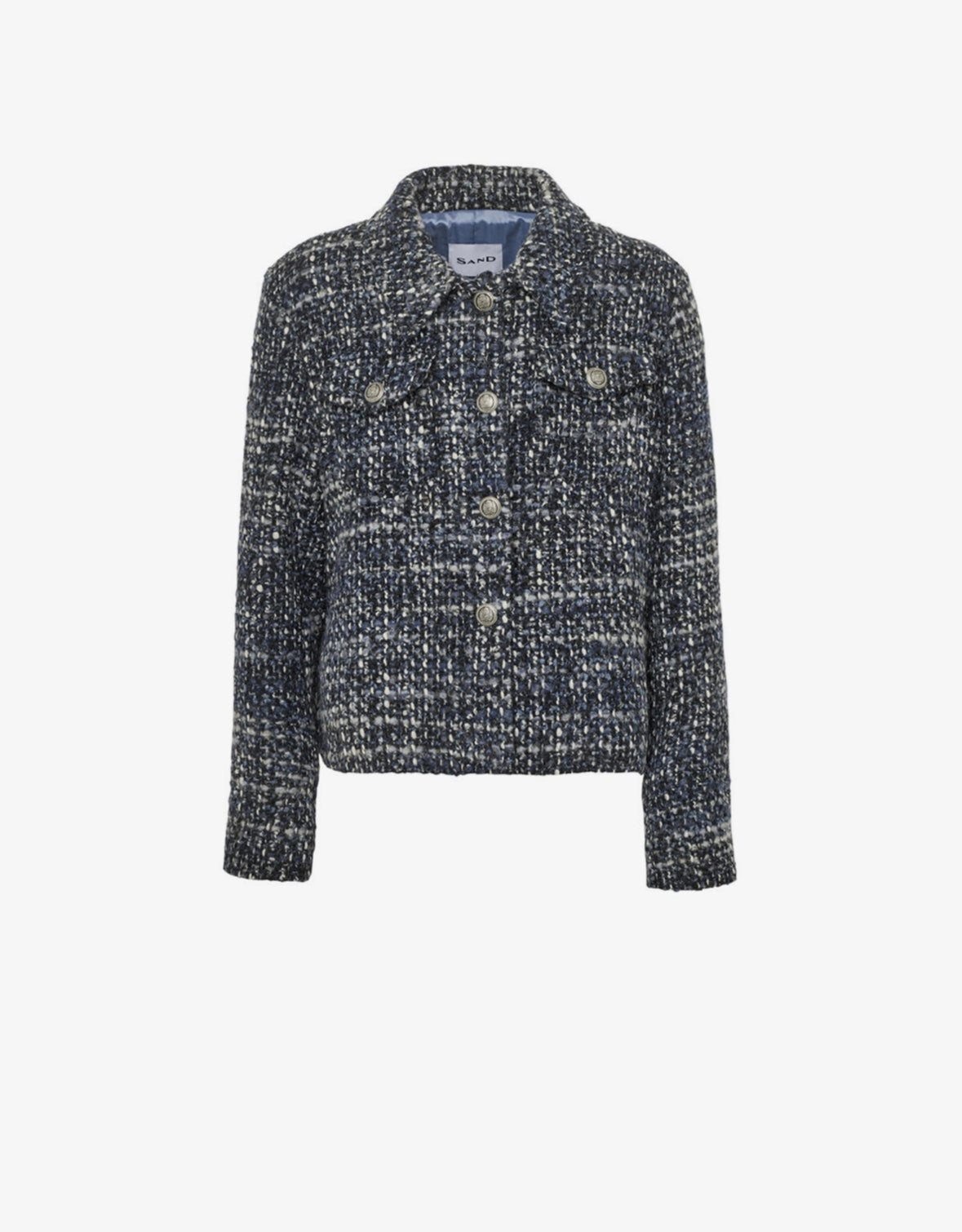 Elegant boucléjakke fra SAND Copenhagen i navy med grå, sort og blå nuancer.