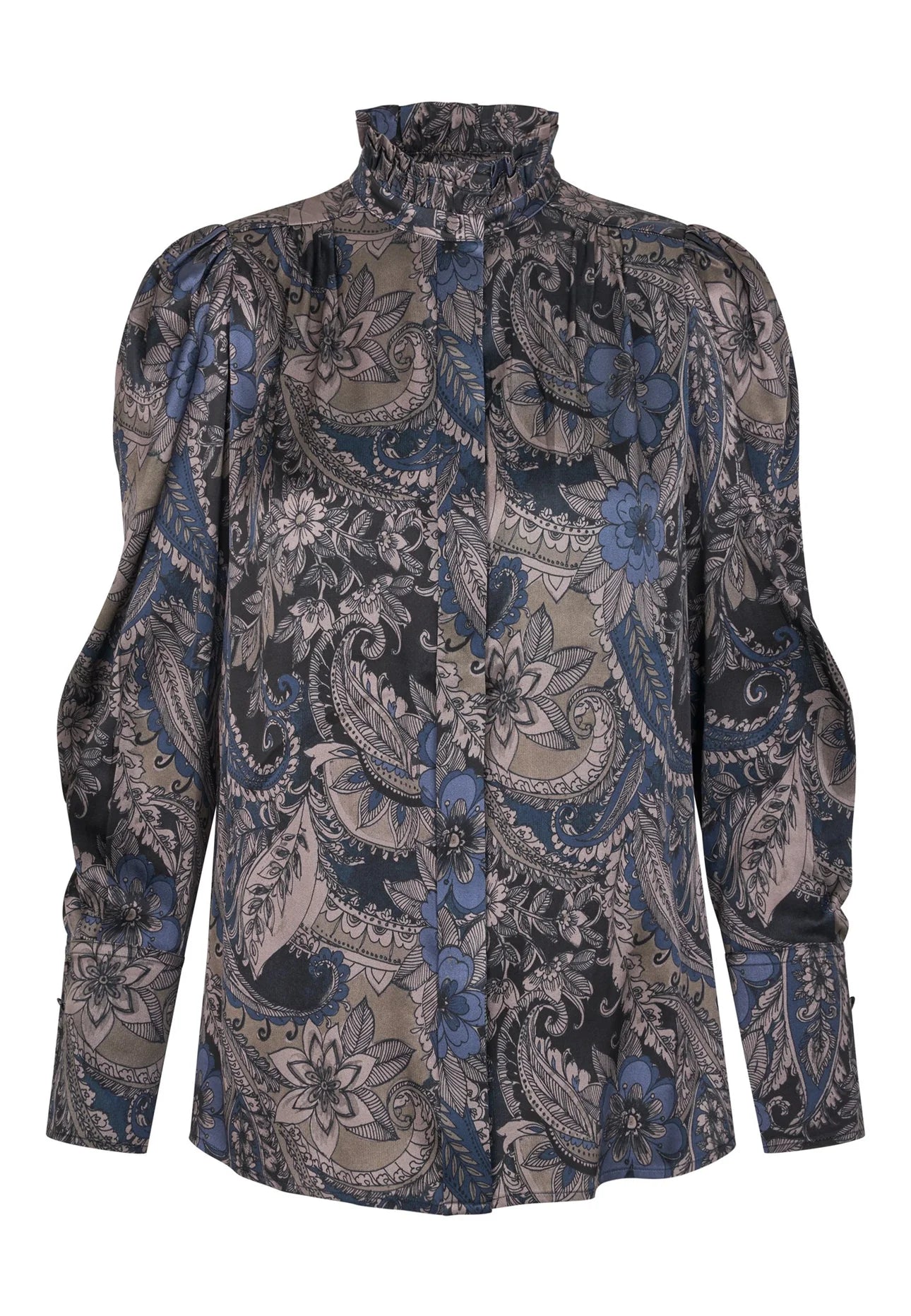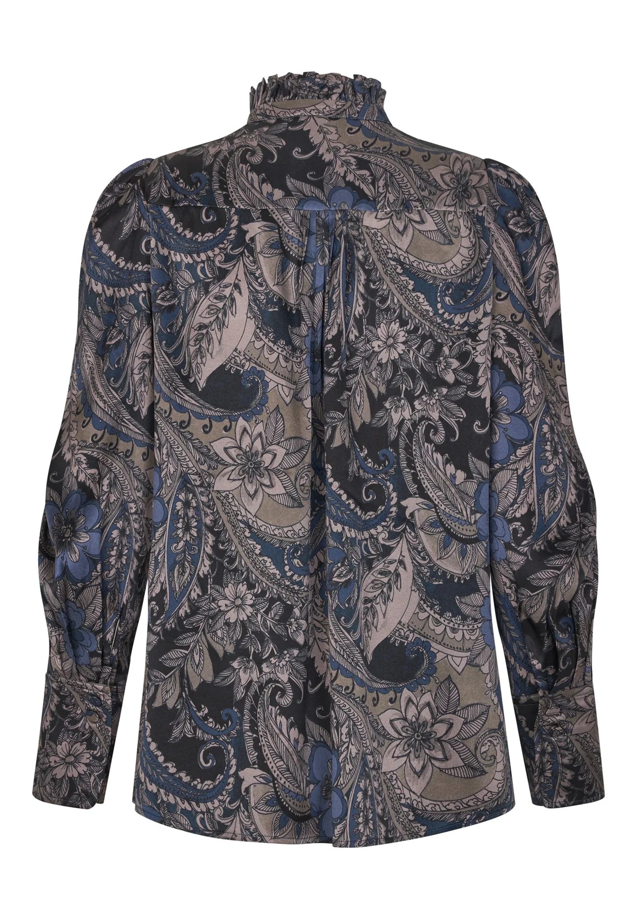 Denne sofistikerede og elegante bluse har to flæser, der skaber en standkrave, og beklædte knapper ned langs fronten. Den er lavet af silketwill i et luksuriøst mørkt paisley-print, har små læg ved halsudskæringen foran og bagpå samt aftagelige skulderpuder i samme stof.
