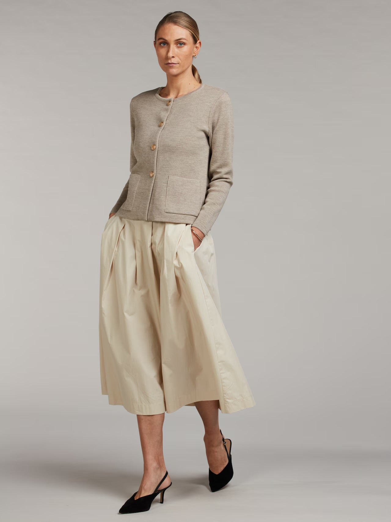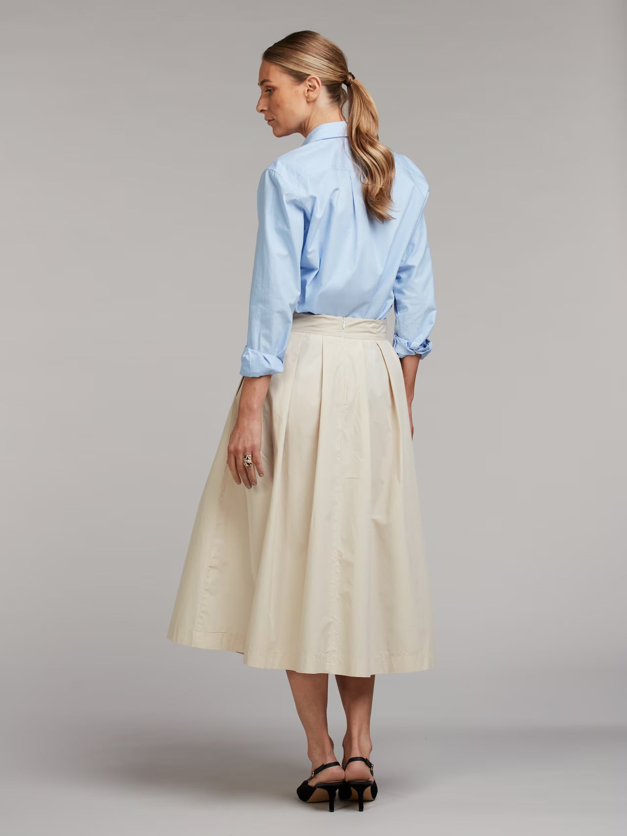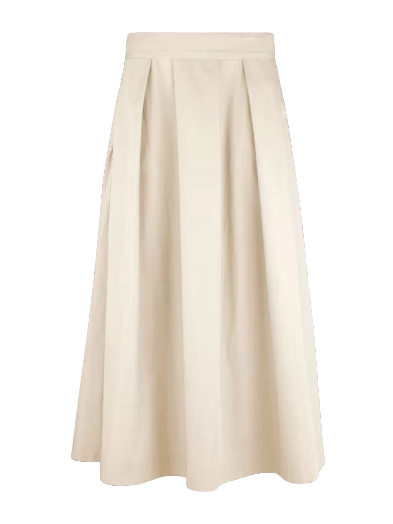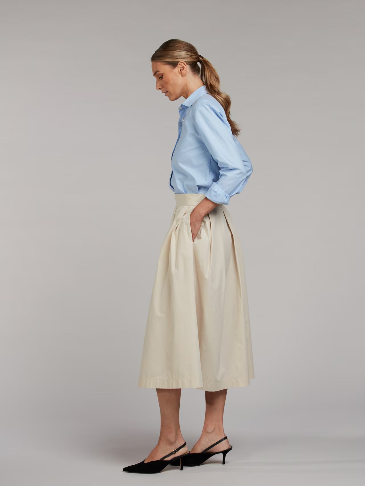 Denne halvlange nederdel er fremstillet i bomuld og har læg i taljen og lommer i sidesømmene.